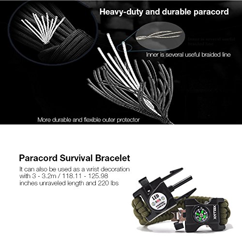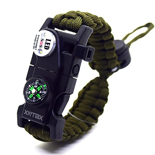 Survival Paracord Bracelet - Survival Gear Kit with SOS LED Light, Compass, Fire Starter, Whistle, Scraper, Emergency Knife - by XNTBX - Wilderness Survival-Kit For Hiking/Camping (Green)