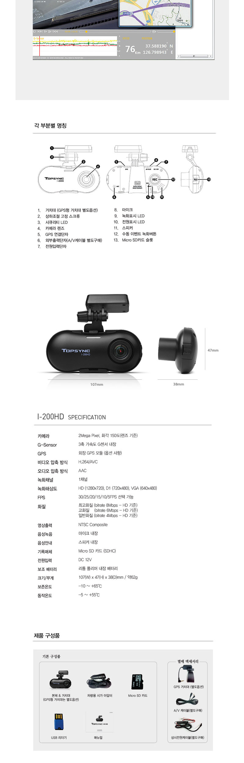 Model: I-200HD Color: Black Image Sensor: HD CMOS Sensor Video Codec: H.264/AVC Audio Codec: AAC Lens Angle: 150 degrees Maximum Pixels: 2.0 Mega Pixel(1280x720) Memory Card: Micro SDHC SD Card(up to 32GB) (8GB SD Card is included) Acceleration Sensor: 3 Shift G-Sensor Power: 12V Built-in Battery: Litium-polymer Size: 107mm(4.2") x 47mm(1.8") x 38mm(1.5") Weight: 62g(0.13lb) Operating Temperature: -5C ~ 55C Product Include: Main Unit, Cigar Jack, Cradle, Micro SD Card(8GB), USB reader, Install Guide.