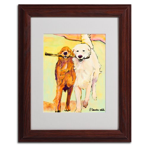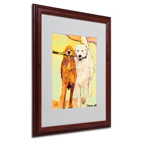 This matted framed art piece features two dogs carrying a stick. Instantly recognizable, the brilliant, saturated colors of Pat Saunders-White;s animal paintings have established her as a national pet portrait artist. Pat brings an element of spontaneity, boldness and humor into a genre that is often stiff and photo realistic. Pat's big 'Ah-Ha!' moment was when she painted her first animal. Fourteen year later, she still finds this an exciting niche. The first animal paintings in this new style and technique gave her a feeling of 'coming home' after a long journey. Pat participates in juried national shows and presents workshops in her home studio and various workshop venues. She donates her work annually to non-profit fundraisers. An 8x10 giclee print under acrylic in a 11x14 dark wood frame. Giclee (jee-clay) is an advanced printmaking process for creating museum quality fine art reproductions. This high quality print is matted using antique white matting and comes in a dark wooden frame. A clear acrylic facing is added to protect the print. The piece is fully assembled by professional frames and comes ready to hang. The antique white mat allows the image to really stand out, making it a great addition to any space.Feature
