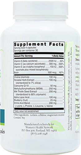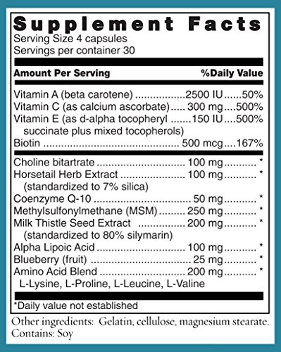 The best way to have healthy skin, hair and nails is to work from the inside out. Our Radiance Formula is formulated to provide your body with a powerful combination of vitamins, antioxidants and botanical extracts to support radiant skin, and beautiful hair and nails. Top ingredients: Alpha-lipoic acid (ALA) - this vitamin-like compound acts like an antioxidant to help repair and protect your skin from environmental damage Biotin - helps with brittle, thin, or splitting nails and hair loss Choline bitartate - helps brittle hair and nails Coenzyme Q-10 - This vitamin-like antioxidant substance supports collagen production, the protein that supports skin elasticity and firmness Horsetail (Equisetum arvense) - long valued as an herbal remedy, horsetail contains silica, and has traditionally been used to improve hair and nail quality and promote skin healing. Methylsulfonylmethane (MSM) - this antioxidant is widely used for a number of concerns, including hair loss, wrinkles, and to help counter skin damage caused by the environment, including sun and wind burn Milk thistle (Silybum marianum) - used most often to help support the liver, the seed of this plant helps protect the skin from environmental damage inflicted by the sun, pollution, and cigarette smoke and is a well-known antioxidant Vitamin A - a key vitamin necessary for proper development and function of skin and other organs, vitamin A is commonly used for its protective and supportive effects in a variety of skin concerns Vitamin C - among its many benefits, vitamin C helps protect the skin from sun, pollutants and other environmental hazards Vitamin E - this antioxidant protects skin against the signs of aging Wild blueberry extract - concentrated amounts of blueberry polyphenols support and protect healthy skin and hairFeature