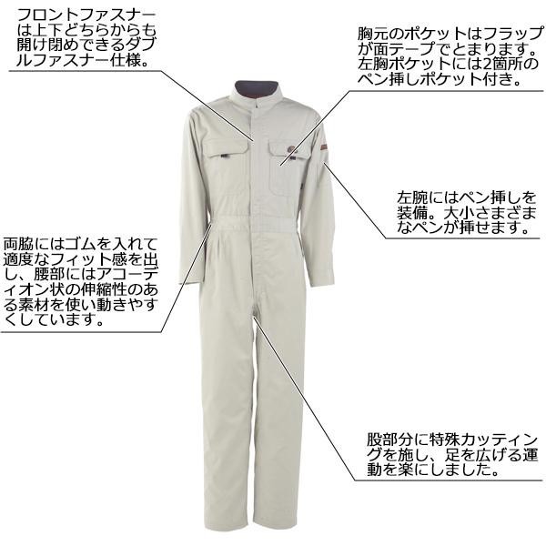 | 肩部分のアクションプリーツや腰部分のアコーディオン状の伸縮素材や股部分の特殊カッティングなど、つなぎ服を着て作業する際の「突っ張り感」を解消する工夫を盛り込みました。フロントファスナーは、上下どちらからも開閉自在のダブルファスナーを採用しています。全身つなぎは一枚で全身を覆ってくれるので、屈んだ時に背中が出るのを気にしないで済むため、作業にはとても向いています。 |