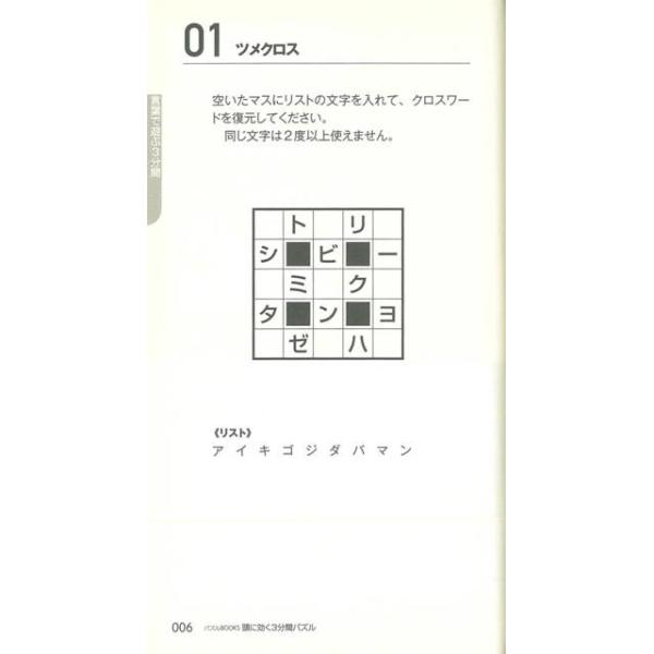 【商品基本情報】 商品名称:頭に効く3分間パズル1 著者/出版社:今井 洋輔/今井 洋輔 初版発行日:2008/10/15 サイズ:新書判 ページ数:128 ISBN/JAN:9784418082247/4528189520349