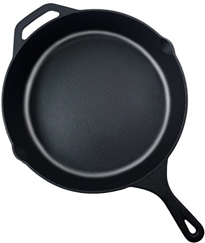 OVERVIEW - Elysian Kitchen's cast iron skillet measures 12.5 inches in diameter with a long handle for added control while on the cooking surface, an assist handle for increased support while transitioning from the cook top to the oven or table, and 2 side spouts that make pouring a breeze