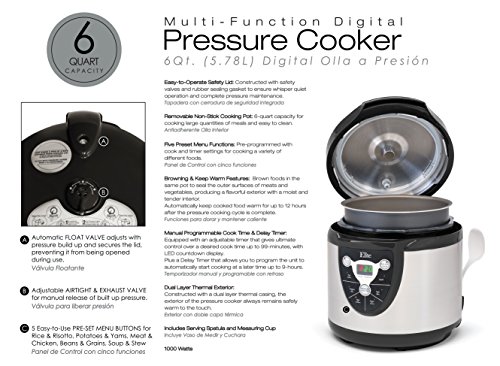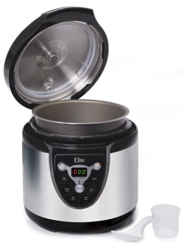 Enjoy faster, more nutritious and flavorful cooking with the Elite Platinum 6 Qt. Electric Pressure Cooker. Pressure cooking food allows you to trap steam during the cooking process, thereby, creating hotter temperatures, sealing in nutrients, and, most important of all, flavor. With 6 preset menu buttons including browning and keep warm, manual operation, a delay timer, and a removable 6 Qt. inner pot you can cook a wide variety of meals for the whole family. 9 hour delay timer allows user to program cooking to begin at a later time. Automatic resumption of cooking when power is restored after power failure to prevent a brief power outage from ruining your meal. Automatic pressure cooking takes all the guesswork out of old-fashioned pressure cookers. Also features an automatic keep warm feature at the end of each cooking cycle to keep food warm up for up to 12 hours. Cook delicious risotto, soups, stews, ribs, chicken, desserts, and much more in this attractive brushed stainless steel Electronic Pressure Cooker.