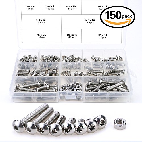 Glarks 150Pcs M5 Stainless Steel Button Head Hex Socket Head Cap Bolts Screws Nuts Assortment Kit