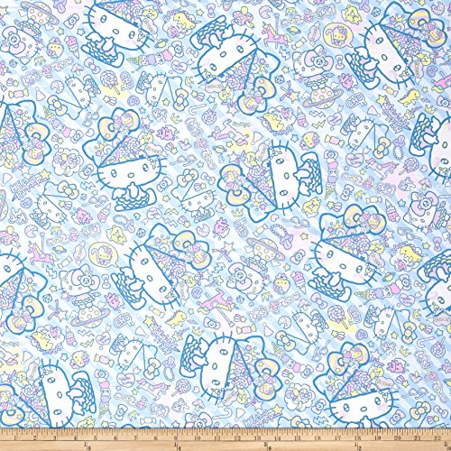 Designed by Sanrio for Kokka and licensed to Springs Creative Products this cotton print fabric is pure chaos with everything that goes through Hello Kitty's brain spilling across the fabric. Perfect for quilting apparel and home decor accents. Colors include pastel yellow shades of light blue lilac white blue and shades of pink. For non-commercial use only.