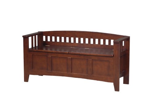 -. Feature : Convenient storage bench with split-seat design from Linon; 1 seat lifts up for access to internal storage / Crafted in solid rubber wood and rubber wood veneers over particle board; rich walnut finish / Low, arched back rest with Mission-style vertical slats; arm rests for added comfort / Requires home assembly; made in Vietnam / Measures 50 inches wide by 17 inches deep by 25-1/4 inches high