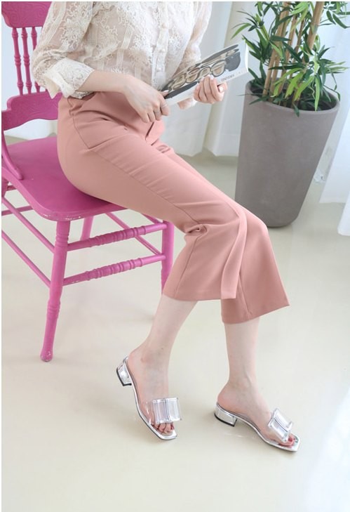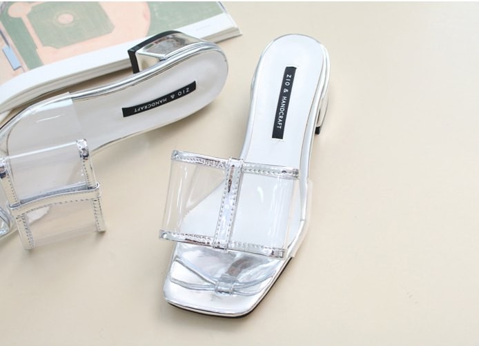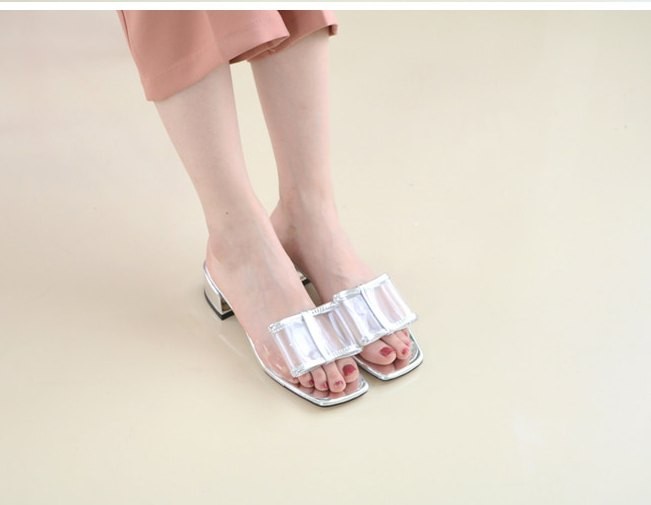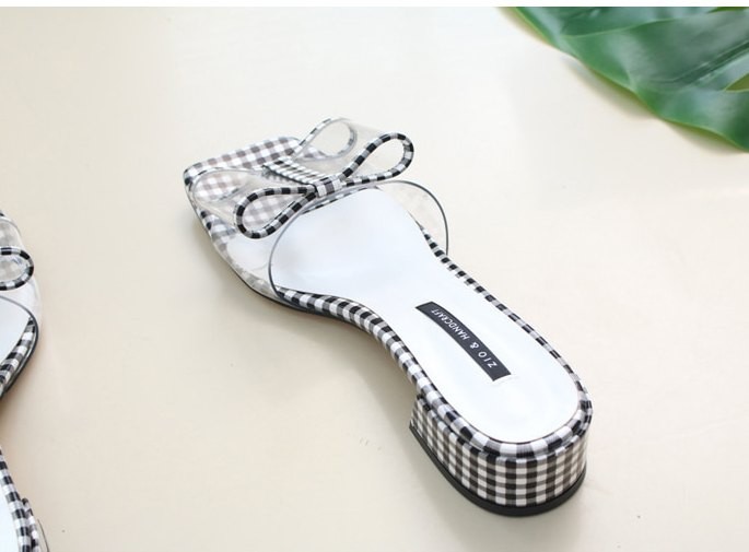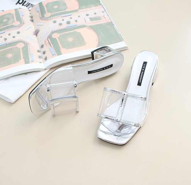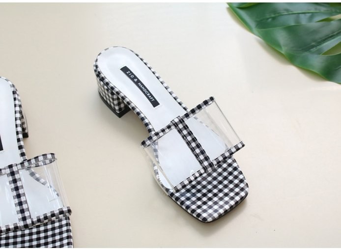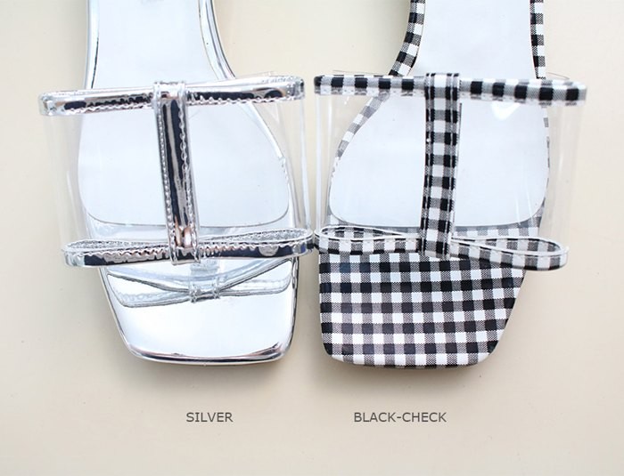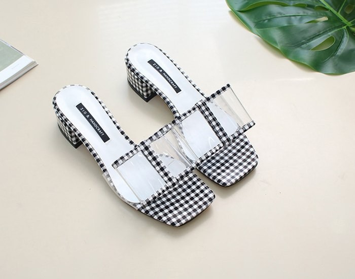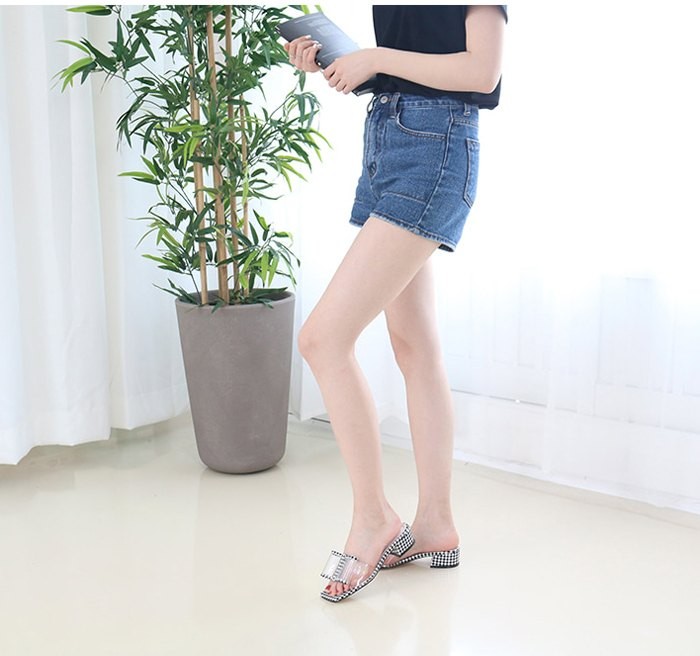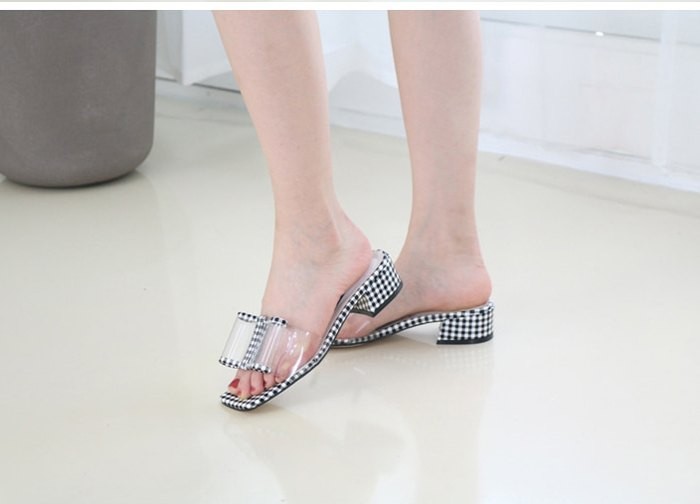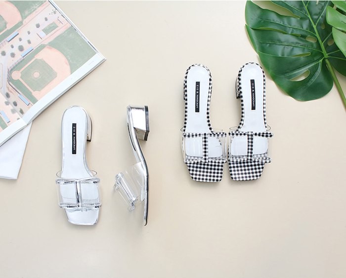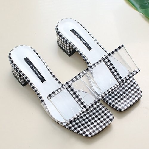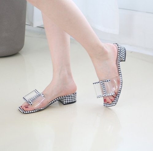 商品名:サンダル レディース ミュール 太ヒール チェック クリアストラップ 2018 夏 ファッション 靴 婦人靴
