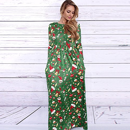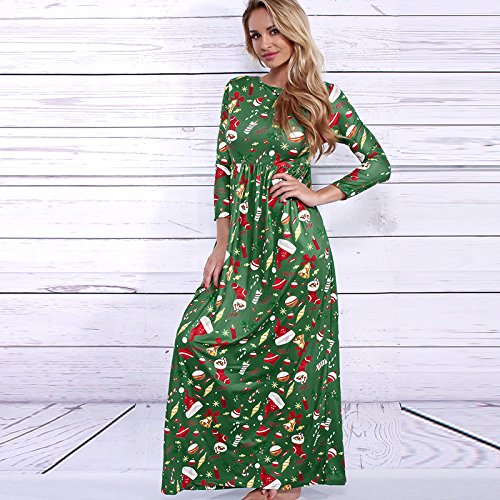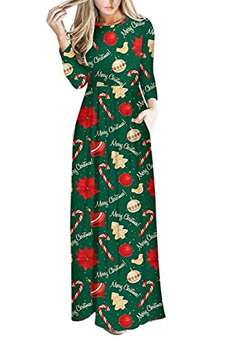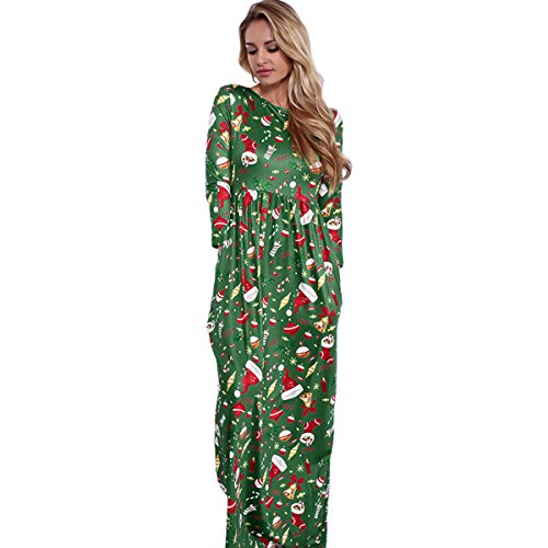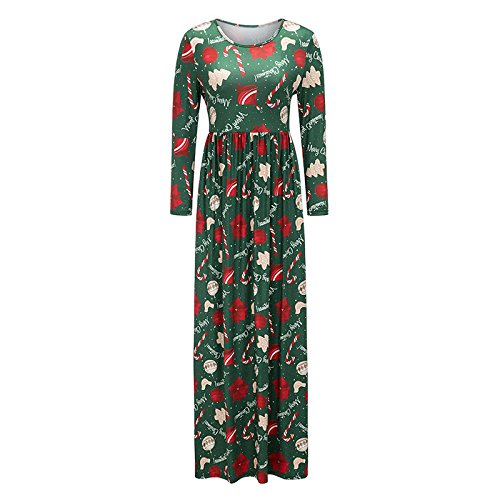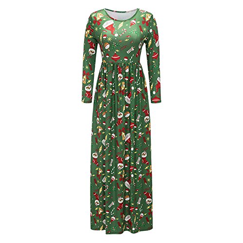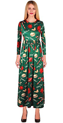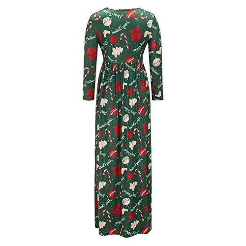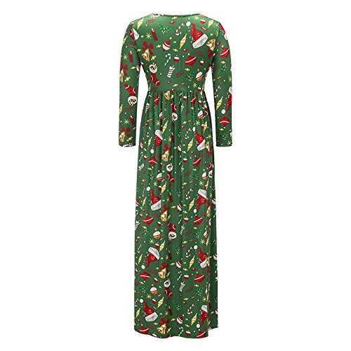 Kinikiss Women's Christmas Santa Snowman Print Floral Long Sleeve Xmas Maxi Party Dress,Dark Green,Medium