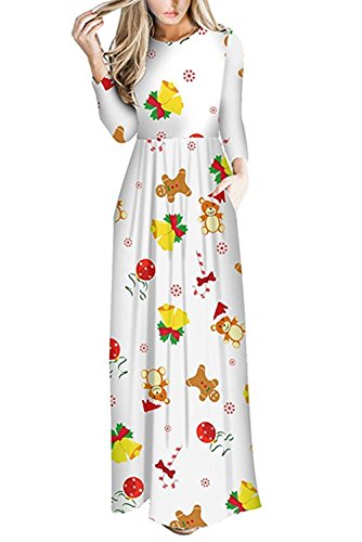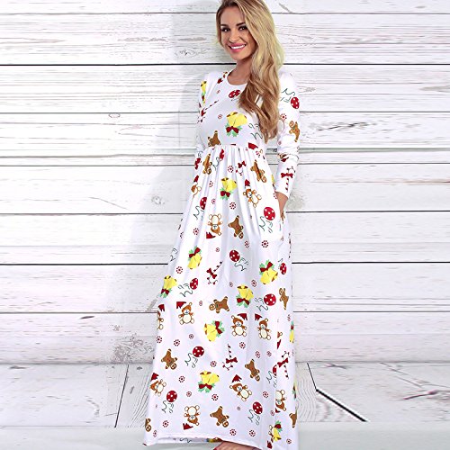 Kinikiss Women's Christmas Santa Snowman Print Floral Long Sleeve Xmas Maxi Party Dress,White,Large