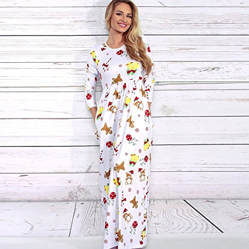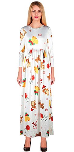 Kinikiss Women's Christmas Santa Snowman Print Floral Long Sleeve Xmas Maxi Party Dress,White,X-Large