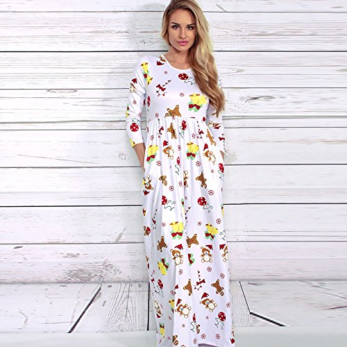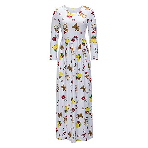 Kinikiss Women's Christmas Santa Snowman Print Floral Long Sleeve Xmas Maxi Party Dress,White,Medium