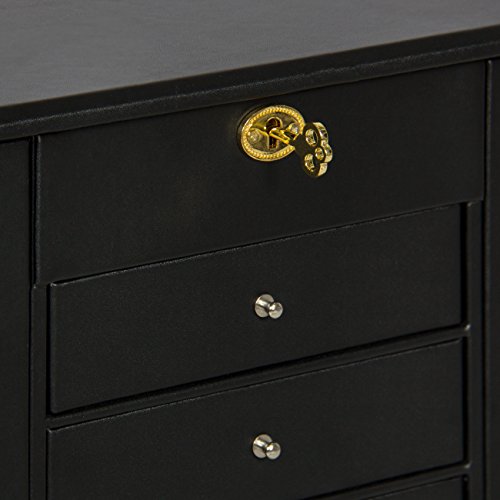 -. Feature : Jewelry cabinet armoire is designed with 6 pull out drawers, 2 side compartments, and a top drawer / Elegantly designed with modern, smooth lines for an attractive and functional piece / Constructed with smooth, PU leather material and a velvet-lined interior / Spacious jewelry cabinet features 10 necklace hooks in each side compartment, 22 total cubbies, and 5 slots for rings or earrings located on the top compartment / Includes keys for locking away jewelry, watches, glasses, and other small essentials; Dimensions: 11"(L) x 6.25"(W) x 15"(H)