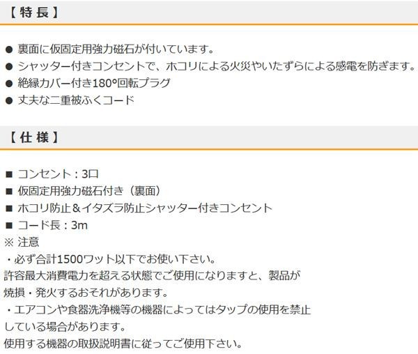 シャッター付きコンセントで、ホコリによる火災やいたずらによる感電を防ぎます。 生産国:中国 ※サプライヤー直送品 ご注文後2~3営業日後の出荷となります【商品名】OHM 磁石付タップ 3個口 3m HS-T1275W