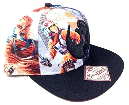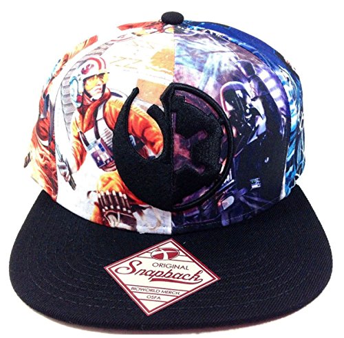 Binding : Apparel Product Description Star Wars VS. Sublimated All Over Print Snapback Hat. Cap design features Heroes on the left, Villains on the right. Front panel features a Galactic Empire / Rebel Alliance logo embroidered in black, background features Luke Skywalker Darth Vader, Left Panels include images of Chewbacca Han Solo, Right panels include images of the Emperor Darth Sideous Stomrtrooper. 0