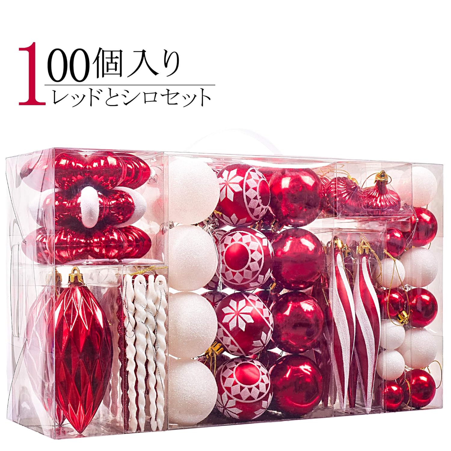 サイズ100個セット・17種類大集合!!お買い得!これ一つでツリーの飾り付けができるお手軽で豪華なオーナメントセットです。 目新しい レッドとシロを基調としたたっぷりのオーナメントセットはイルミネーションと一緒に飾れば、キラキラと美しく反射して、幻想的なムード満点。 ただ一つの単品でツリーを360度全面的に飾りたいお客様におすすめです。 北欧風のオーナメントセットでお手持ちのツリーがキュートと華麗に大変身♪。 アクセサリーはすべてひもをつけて,とても便利につるすことができる.包装も頑丈なデザインを工夫しましたので、ご安心ください。ただ一つの単品でツリーを360度全面的に飾りたいお客様におすすめです。