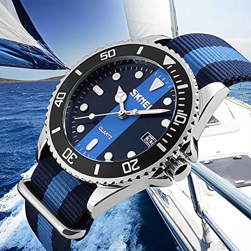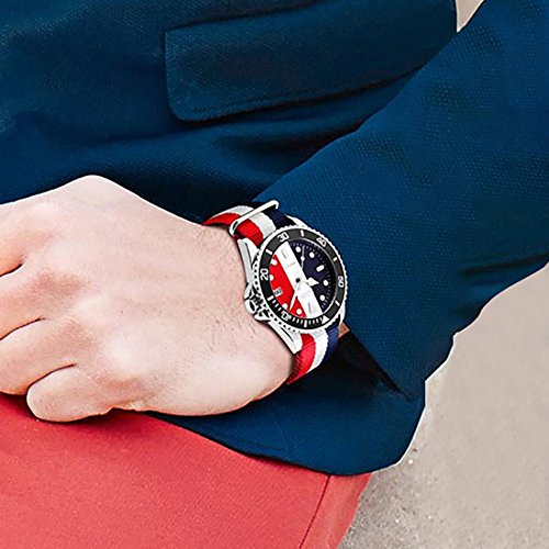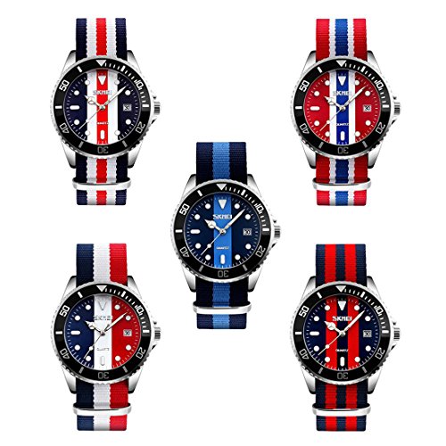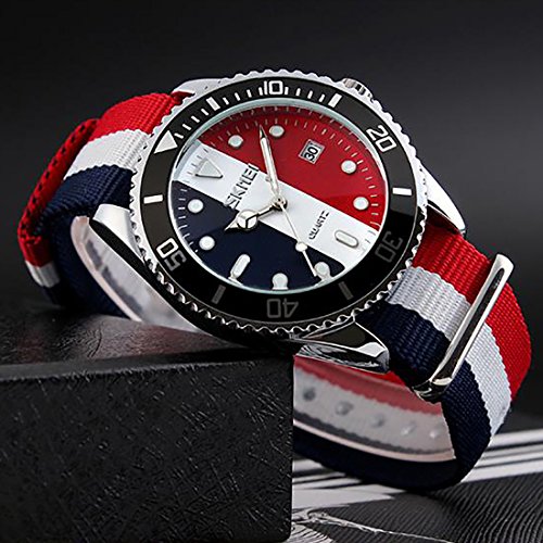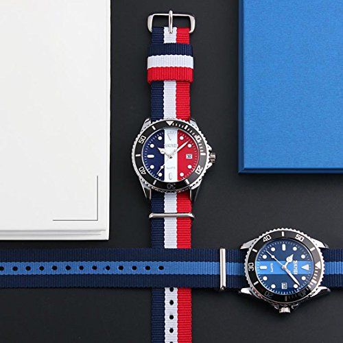 -. Feature : Nylon Band: Canvas band with center stripe and buckle closure, colorful nylon strap. Exceptionally strong, abrasion resistant, low in moisture absorbency & easy to wash. / Simple classic casual design: Affordable casual design, canvas band, round big dial dress watch with stainless steel case featuring white dial, simplicity of business casual, bring you the back to the classic. / WaterproofF for daily use:98 ft waterproof (30 M) - 3ATM. Perfect for all kind of business, casual, indoor activities or daily use. NOTE:In general, withstands splashes or brief immersion in water, but not suitable for swimming. / Come with a gift box, can wear it own or can be given as a gift for Birthday, Thanksgiving Day, and Christmas. / After Sale Service: If you have any questions about the product, you can contact with us and we will try our best to help you.