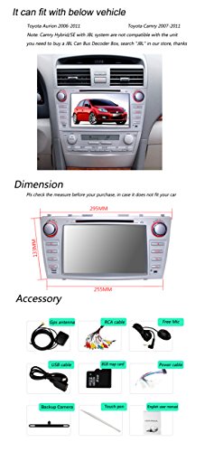 - Feature : Plug and play in-dash vehicle gps unit only for Toyota Camry without JBL Sound, if your car has JBL sound system, then you need to buy a Can Bus decoder to decode the sound, otherwise there will be no sound, search "Can Bus" in our store and add to cart thanks / Double Din in Dash car DVD GPS player with 8 inch 800*480 WVGA resistive touchscreen, anti-glare, day night readable; Loaded with Win CE 6.0, ARM11 processor core 800MHz CPU, DDR3 256MB RAM / Compatible with top GPS software, built-in GPS navigation; Bulit-in bluetooth for hands-free calling and phone music playing; Support AV-IN reverse camera, DVR Digital Video Recorder, Steeing Wheel Control / Support iPod/iPhone audio input; 30 stations of analog AM/FM RDS radio; Support music or video playback via SD/USB/DVD/CD/AUX-IN; Features VMCD to record 6 disc tracks into one USB drive; Suppor DTV ATSC TV Tuner; Support subwoofer and EQ; 4*50 Max Output Power / Free microphone, Free map in a Free 8GB map card; 12 months warranty for quality-related issues; Doorstep delivered within 3-7 business days by FREE DHL AIR EXPRESS rather than one month suggested by amazon