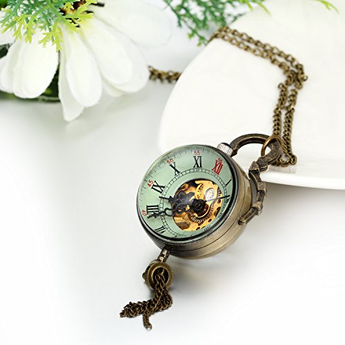 -. Feature : Glasses Dia Window Vintage Unique Mechanical Skeleton Pendant Necklace Pocket Watch Bronze Hand Wind / Chain Length: 32.2"(82cm),Case Diameter: 1.2"(3.1cm), Thickess: 1.2"(3.1cm) / Pocket Watch Necklace Pendant. Perfect Cosplay Accessory. / Skeleton Dial with Hand Wind Mechanical Movement / Including one blue velvet bag P.R.Inted "JewelryWe" on it.
