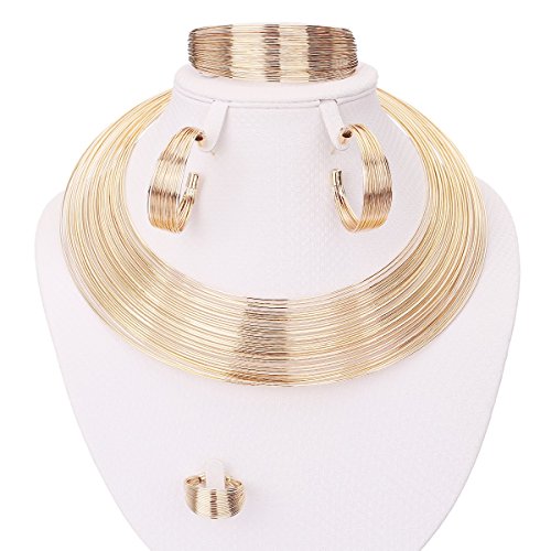 -. Feature : 5 PCs Gold Plated Jewelry Set / Including 1 necklace + 1 bangle + a pair of earrings + 1 Ring in the jewelry set; / Size: As Picture; the ring is open size. / The surface of the jewelry is gold plated and the material is alloy. It will never fade and is not allergy for your skin. / This jewelry set is shinning, beautiful, luxury looking. It is suitable many occasions, such as dance, party, celebration and wedding. This set is an ideal gift for your girlfriend, fiancée, wife, mother or friend.
