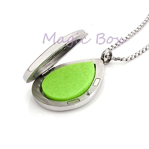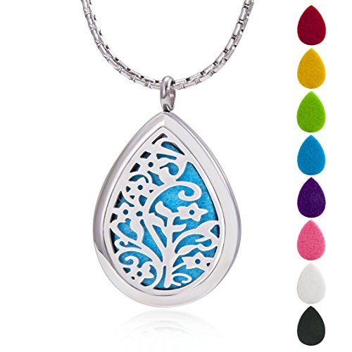 Material: 316L surgical stainless steel. Size: 30 mm width Locket, with 60 5 cm round box chain 2.5 m width. Color: unfading nature steel color. Usage: essential oil diffuser necklace, you can wear and enjoy your essential oil any where. Feature: water drop/Teardrop shape, with free chain and 8-color washable cotton pads.
