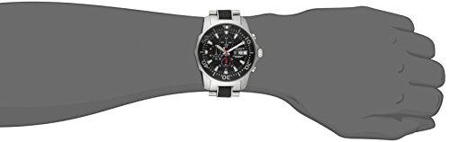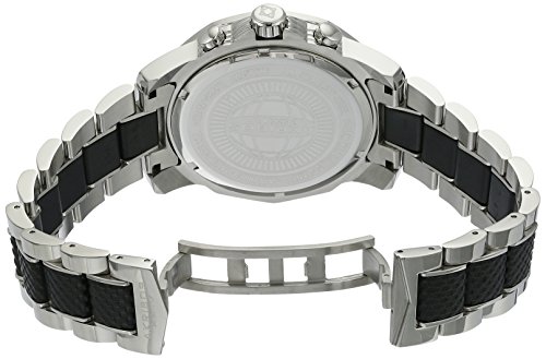 -. Feature : Black matte finish dial with chronograph feature and date display window at 3 o'clock / Silver tone stick index and silver tone baton style hour and minute hands / Polished stainless steel case with stainless steel bracelet and black center links / Chronograph quartz movement with analog display / Water-resistant to 30 M (100 feet)
