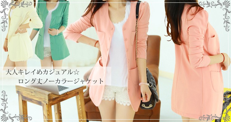 | スタッフコメント | いつものカジュアルスタイルにこれ一枚をプラスすれば、簡単キレイめスタイルに♪長めの丈で気になるおしりもすっぽり♪ いつでも気軽に着れるポリエステル素材。丸首のノーカラーがキュートでスタイリッシュなあなたを演出。 ふんわりパフスリーブがかわいい☆小顔効果も期待しちゃいますね♪ さわやかカラーが暑い季節にも涼しく魅せてくれます。 360度どこから見てもスタイリッシュ☆ |