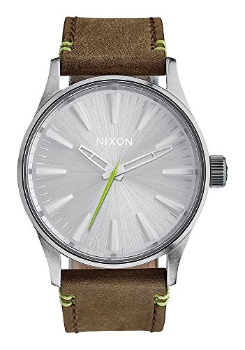 The Sentry 38 Leather watch by Nixon is perfect for any athletic man This watch is made with a leather band and stainless steel case These long-lasting materials guarantee extended use of the product and a satisfied owner The brown band silver dial and silver hands add to the tough exterior This piece is also crafted with a sturdy mineral crystal to protect the dial and is powered by a japanese quartz movement to ensure you are always covered Additionally this product is water resistant up to 100 meters 330 feet 10 atm which is ideal for those who enjoy water sports The durable hardware and unmatched quality of the Sentry 38 Leather watch by Nixon will help you accomplish anything you put your mind toFeature