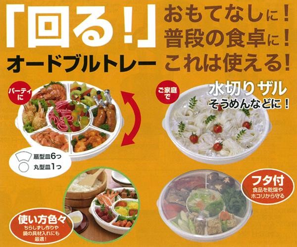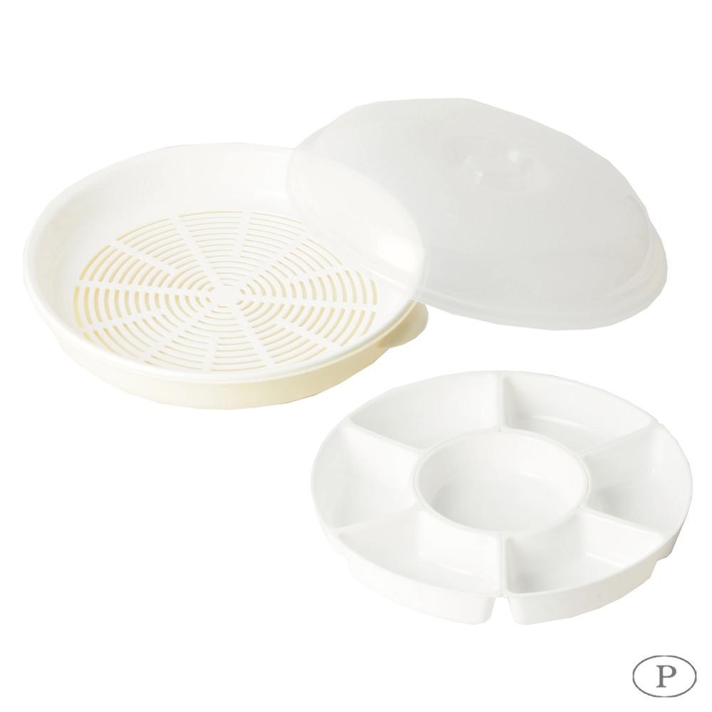 そうめんなどに使える水切りザルと、パーティにぴったりな回るオードブルトレーのセットです。乾燥やホコリから守るフタ付。