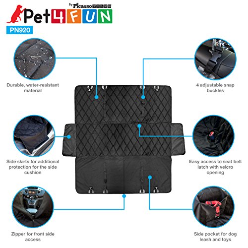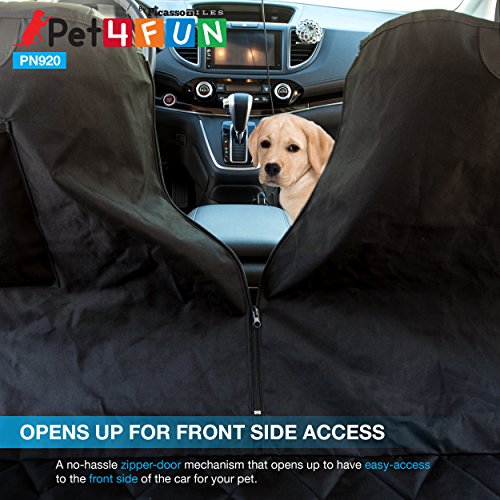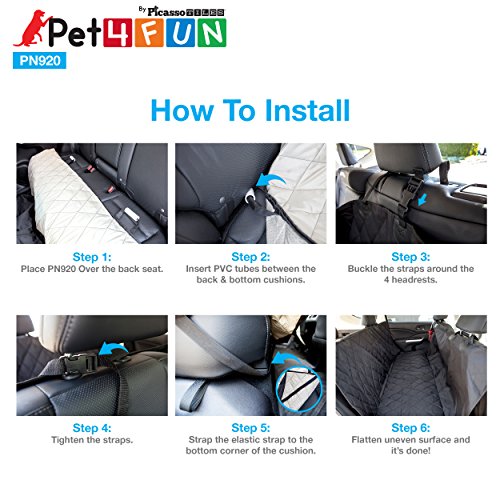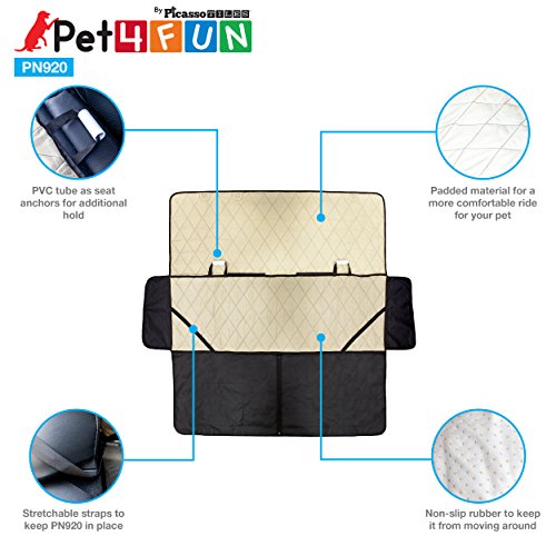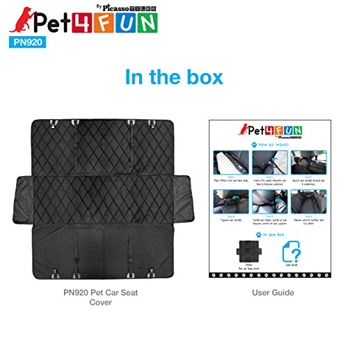 -. Feature : • WATERPROOF CONSTRUCTION MATERIAL AND SIDE-FLAP EXTENSIONS DESIGN - PN920 is made of thick layers of fabric stitched together which creates an extremely durable dog seat cover capable of withstanding the most active pets. The top waterproof layer keeps your car clean from any type of unforeseen accidents. 8" side-flap extensions provide extra coverage to your seat cushions. / • FITS OVER THE BENCH SEAT OF CARS, TRUCKS, AND SUVS - 53 by 58 inches allows full coverage over the back seat of standard cars, trucks, & SUVs. Use it as a simple seat cover or hook the snap buckles over the front seat headrests to create a pet hammock. The hammock option is great for minimizing rustle. / • VELCRO SEAT BELT OPENING & QUILTED PATTERN PATTED MATERIAL - Featuring easy access seatbelt opening which can always ensure your puppy is hooked into the back seat using the seat belt. Quilted pattern patted material provides extra layers of comfort for your pet dogs. / • SIMPLE DESIGN ALLOWS QUICK INSTALLATION IN SECONDS - Push the seat anchors down between the seat base and back seat, then loop the adjustable snap buckle straps around the headrests. That is really all it takes to keep your car clean and be on your way with your furry co-pilot. / • MACHINE WASHABLE - The PET4FUN PN920 pet dog seat cover is completely machine washable to offer hassle free and extremely easy clean up option after the dirtiest trips. Additionally, the waterproof material allows it to be cleaned effortlessly by hand as needed.