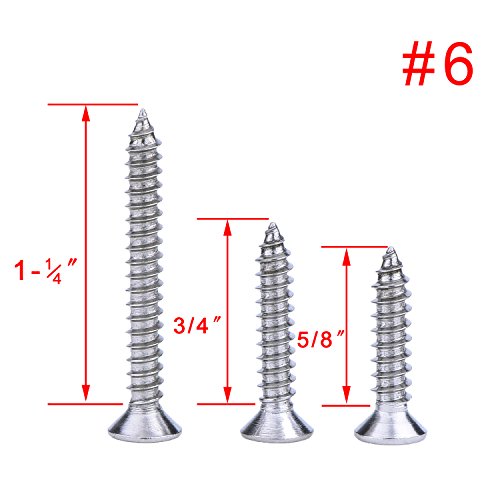 Wood screws: 3 sizes are #6 x 3/ 4 inch, #6 x 5/ 8 inch, #6 x 1 - 1/ 4 inch, with phillips flat head, 50 pieces each size, total is 150 pieces
