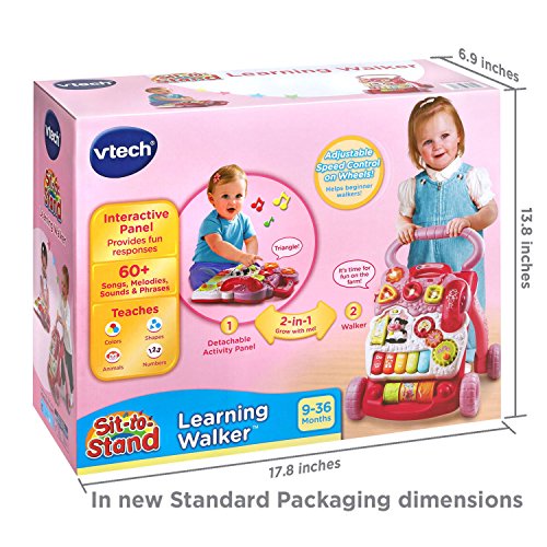 From baby steps to big steps the Sit-to-Stand Learning WalkerTM by VTech® helps your baby develop from a crawler to a walker through adaptive technology. With a barnyard of playful friends to cheer them on, your little one will have endless fun as they learn to walk. Start out with the easy-to-remove activity panel for floor play or on-the-run fun, then step it up with the fun-to-maneuver walker. Spinning gears, five piano keys, three colorful rollers, three light-up shape sorters, three light-up buttons and a telephone handset offers endless fun that will stimulate your baby's learning and develop their motor skills. The Sit-to-Stand Learning Walker keeps baby on track teaching shapes, colors, animals, music and more!Feature