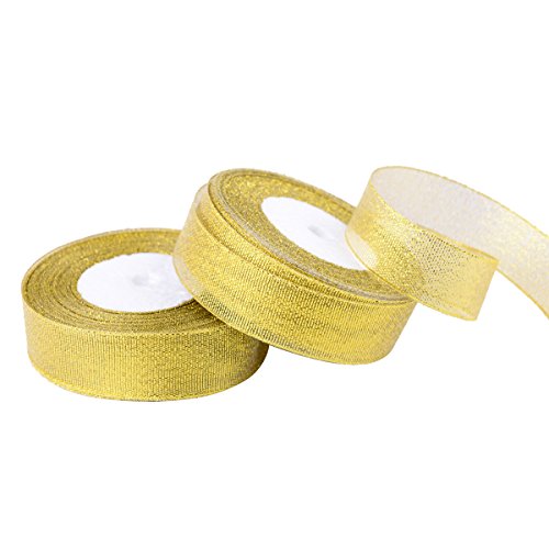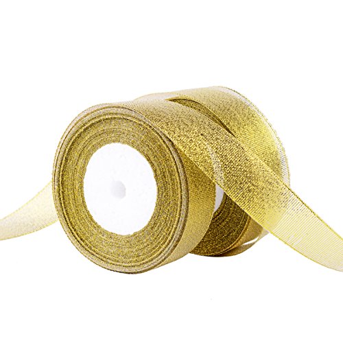 Feyarl 1-inch Wide by 50-yards (2 rolls X 25yd) Premium Glitter Metallic Sparkle Ribbon for Crafters, Wedding, Holiday, Home Decoration, Gift Wrap, Card Making, Hair Bows, Floral Projects (Gold)
