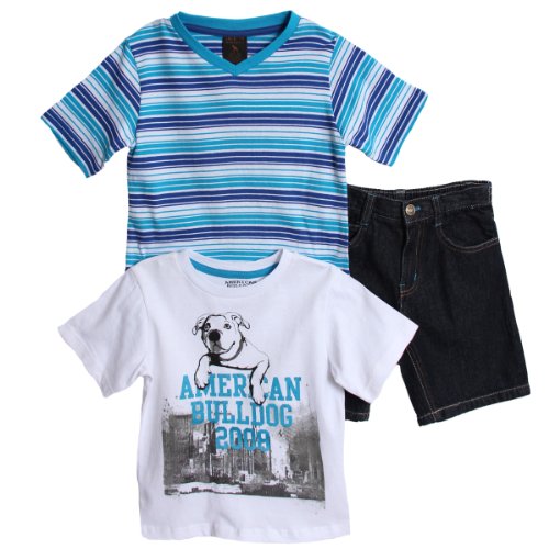 -. Binding : Apparel -. Brand : American Bulldog -. Color : Blue -. Department : boys -. Feature : 3 piece set / White short sleeve t-shirt / Blue v-neck striped t-shirt / Denim shorts have a button and zipper closure and back elastic / Cotton -. Label : American Bulldog -. Manufacturer : American Bulldog -. MPN : hs2106 -. PackageQuantity : 1 -. PartNumber : hs2106 -. ProductGroup : Apparel -. ProductTypeName : SHORTS -. Publisher : American Bulldog -. Studio : American Bulldog -. Title : American Bulldog Little Boys' 3 Piece Blue Striped T-Shirt Denim Jean Shorts Set