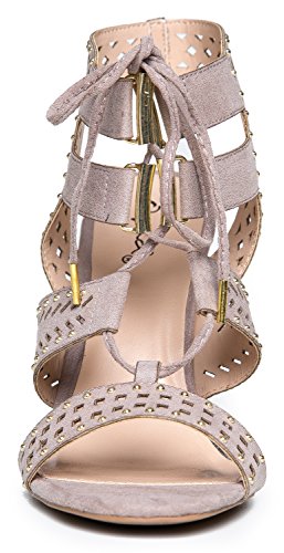 Binding : Apparel Product Description Stride with Confidence in this Laser Cut Studded Sandal Perfect For Day Or Night. Features Faux Suede With Open Toe Silhouette, Strappy Design Adored With Studs and a Chic Ankle Cuff and Ghillie Laces Set on a Stiletto Heel. ara235 Chic gladiator cage-like heels featuring open toe,faux leather, lace up closure with elastic ties and block wrapped heels and will match with leggings or a cute dress. 0