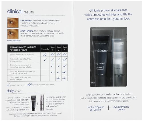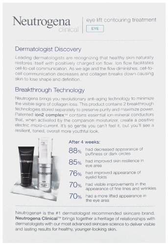-. Binding : Health and Beauty -. Brand : Neutrogena -. Color : None -. EAN : 0885530835250 -. Feature : Ion2complex gel serum / Instantly brightens and smoothes lines and wrinkles / Lifts and contours the eye area / Gentle enough for daily use / After 4 weeks 88% had decreased appearance of puffiness or dark circles -. IsAdultProduct : 0 -. Label : Neutrogena -. LegalDisclaimer : This product can be shipped to any country to which SkinStore currently ships -. Manufacturer : Neutrogena -. Model : 680572600 -. MPN : 5726 -. NumberOfItems : 1 -. PackageQuantity : 1 -. PartNumber : 5726 -. ProductGroup : Beauty -. ProductTypeName : BEAUTY -. Publisher : Neutrogena -. Studio : Neutrogena -. Title : Neutrogena Clinical Eye Lift Contouring Treatment, 0.34 Ounces Box -. UPC : 885300649674