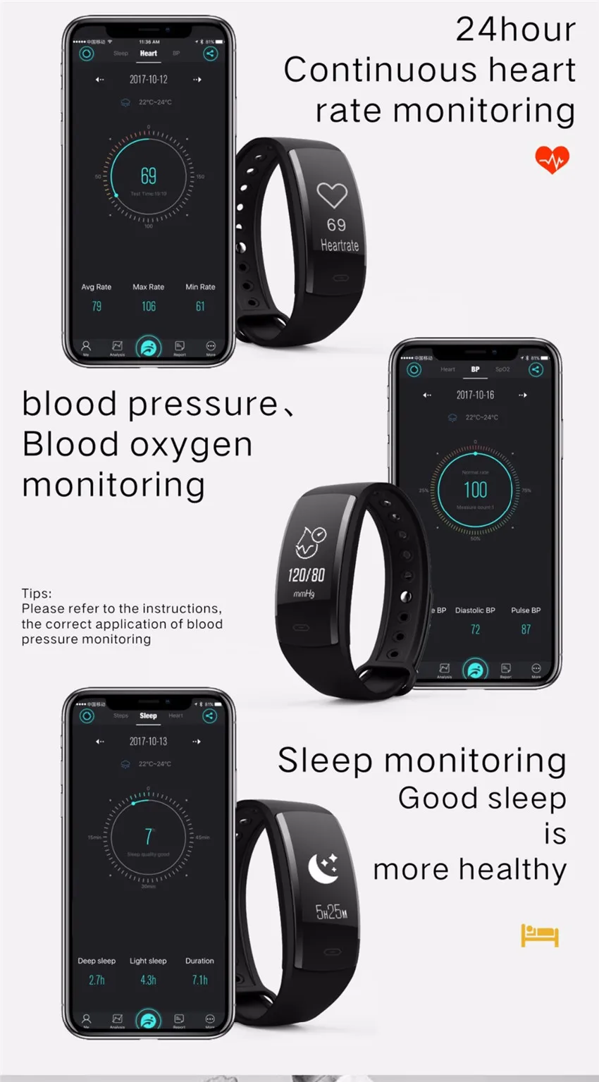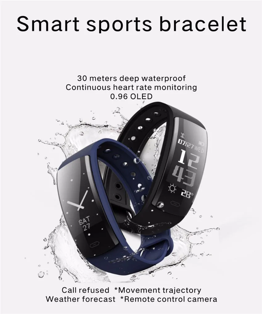 Function:Remote Control,Noctilucent,Alarm Clock,Push Message,Passometer,Message Reminder,Sleep Tracker,Heart Rate Tracker,Call Reminder,Fitness Tracker