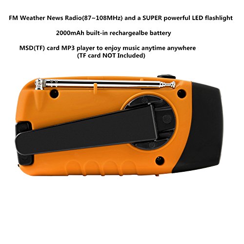 -2000mAh built-in rechargealbe battery.FM Weather News Radio(87~108MHz) and a SUPER powerful LED flashlight with cell phone charger