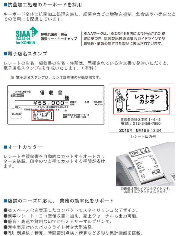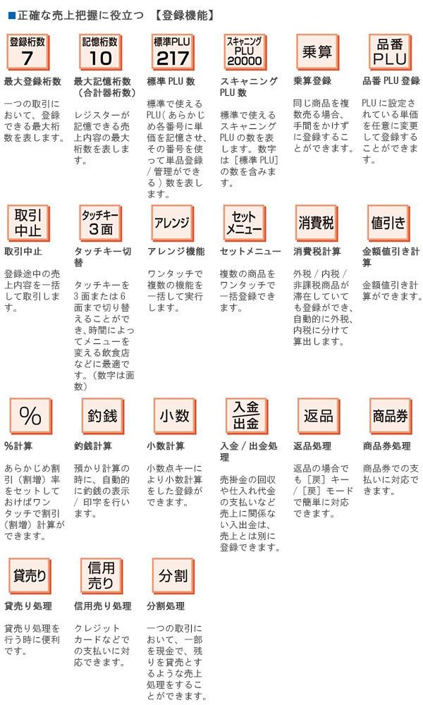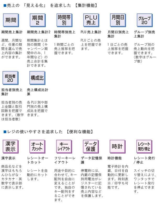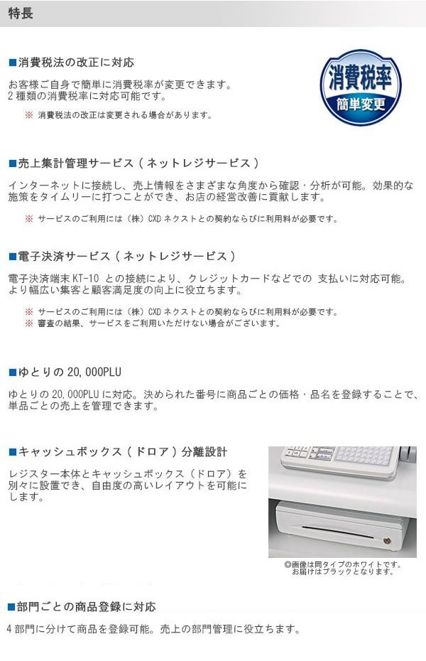 | 付属品 | 取扱説明書、保証書(1年間)、モード鍵(PGM)×2、ドロア鍵、ロールペーパー、ジャーナル巻き取りホルダー |