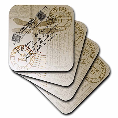 3dRose cst_79319_1 Vintage Dragonfly French Postcard Soft Coasters, Set of 4