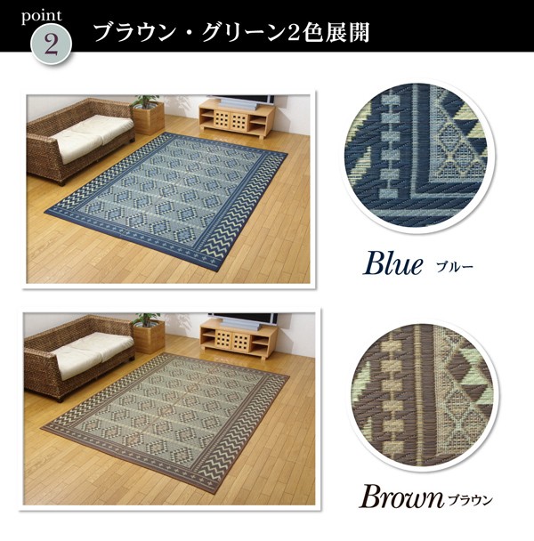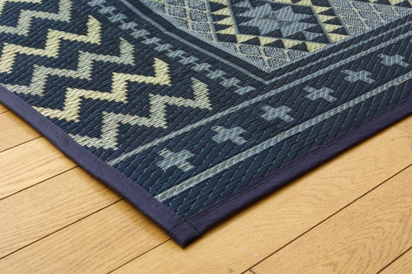 縦糸の本数が多い袋織りという技法で繊細な柄を出しています。折れ曲がりが複雑なので長いイ草を使用しないと切れてしまいます。縦糸が密なので、しっかりとして破れにくいのが特徴です。国産(九州産)のい草を使用しています。一本一本が太く、表皮が厚く繊維がキメ細かいので弾力性があり、耐久性に優れています。い草には空気の自然浄化作用、湿度の調節作用などがあります。また汚れにくく、使用するうちに黄金色に変化し味が出ます。い草に青森ヒバ加工を施しています。(抗菌、防臭効果)裏にはウレタンを貼っていますので適度なクッション性があり、フローリングでのご使用にも適しています。