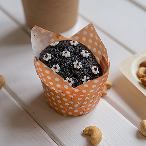 GREASE-RESISTANT FOR LESS MESS: From mini-muffins to cupcakes to savory meatballs skewered with a toothpick, these orange polka dot patterned baking cups shrug off the grease while maintaining moisture.