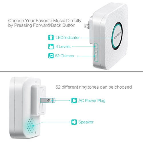 -. Feature : Long Range Operate: It can work within 200-700 feet through the mental security doors and walls, and can work within 900 feet in open and noninterference environment. / 52 Different chimes: There are 52 different ring tones with 4 levels of adjustable ringing volume from 30-110dB. The receiver and the transmitter will flash blue light to give a friendly hint. / Expandable: You can expand each receiver with additional push buttons or multiple receivers for one button. And each receiver can be configured with different tones, therewith to tell different visitors from different positions. / Waterproof and Low power consumption: The push button is rated IP44 weatherproof for outdoor use. It operates normally at temperature between -30℃-70℃/-22℉-158℉. Power consumption of deliver below 0.5A, and transmitter below 10mW. / Easy to installation: Screws and double-sided adhesive tapes included for easy installation of the transmitter .No batteries required for main receiver, just plug the receiver into an electrical outlet. Push button can be fixed to the doorframe with the attached adhesive tapes.