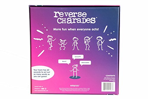 Charades is better when everyone gets into the act! Award winning Reverse Charades is a hilarious twist on the classic game of charades. Instead of one person acting out a clue for a team to guess, a team acts out clues for one person to guess. Now everyone is in on the fun! In 60 seconds, teams attempt to guess as many words or phrases as they can. The team with the most correct guesses wins. Perfect for family fun, parties or team building. Now everyone is in on the fun! In 60 seconds, teams attempt to guess as many words or phrases as they can. The team with the most correct guesses wins. Perfect for family fun, parties or team building.Feature