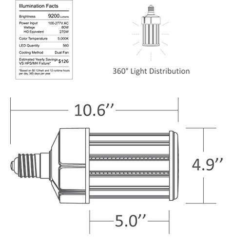 80W LED CORN LIGHT BULB 5000K Replaces 600W, 9,200 lumens Mogul Base E39, 100-277V AC UL/cUL DLC