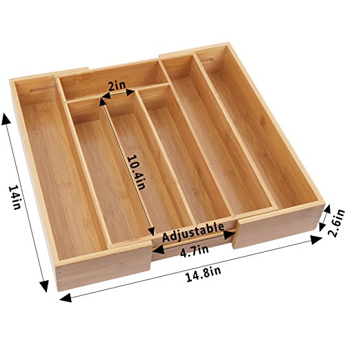 ?Contemporary style ?Clormaterials: Natural bamboo and MDF finish on the bottom.,Durable and eco-friendly materials. ?Gentle on utensils and will not scratch or leave marks on your silverware. ?Kitchen cutlery tray fits most standard sized kitchen drawers,Home organization made easy. ?Limited lifetime warranty. ?Dimensions: Adjustable measure:14.76*10*2.56 inch,close measure:13.98*10*2.56 inch. ?Wipe with corn/canola oil to preserve shine.