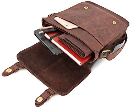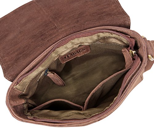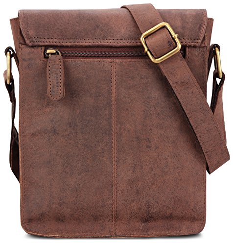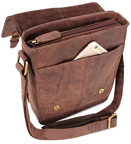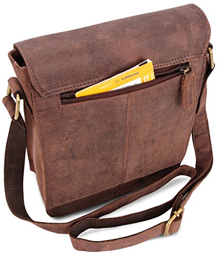 -. Feature : Highlights: genuine buffalo leather - Top quality - Classy vintage look / Features: thanks to the fine stitching and the excellent manufacturing, this genuine leather bag is a stylish and loyal companion for your everyday life. / Measurements (L x W x H): approximately 7,9 x 9,4 x 2,5 in / This shoulder bag is incredibly roomy. The many pockets and a large main compartment offer plenty of space to carry your belongings. / Ideal comfort: the shoulder strap is reinforced by a strong nylon lining, which makes the bag more comfortable to carry.