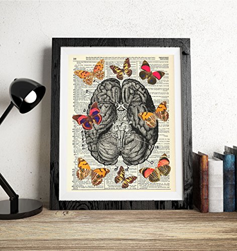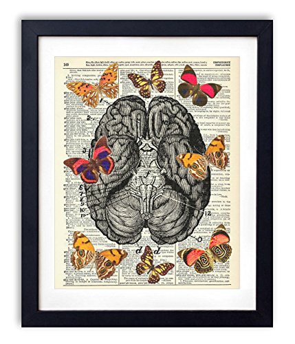 Butterflies On The Brain is a beautifully printed design on an authentic antique dictionary page from the early to mid-1900's. The pages that are used for each print are random pages from a vintage dictionary. Each page has a great antique look and feel. You will receive the exact image shown however the dictionary pages that are used will vary. This makes each print a one of a kind, as no two pages will be exactly the same. Each print measures 8x10 inches unless otherwise noted. Colors may vary slightly from the image shown. The prints DO NOT come framed, but will fit any standard 8x10 frame or any larger frame with an 8x10 matte. Our prints look amazing framed and displayed in any room of your home. They also make great one of a kind gifts!