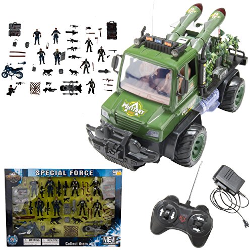 -. Feature : Full Function (forward, backward, left and right motions) / High detail accents complete with foliage wrapped railing, fixed rocket missiles, and fixed army men figurines / Flashing lights, sounds, military Green paint job with graphics | Matte color accented wheels with rubber tires / Includes RC vehicle, rechargeable power pack for vehicle, charger, and remote control | Remote control requires 1 9V Battery (Not included) / Also includes 52pc Special Forces Action Figure Set | Vehicle measures 12.5" x 6.5" x 5.5"