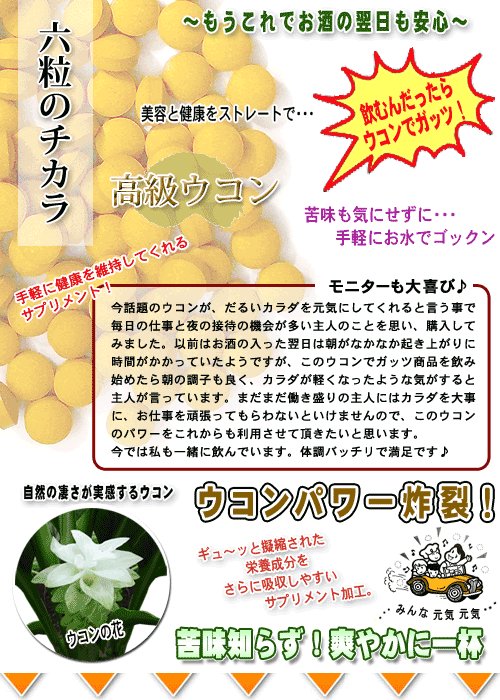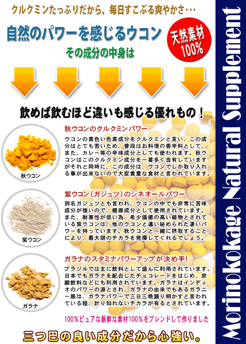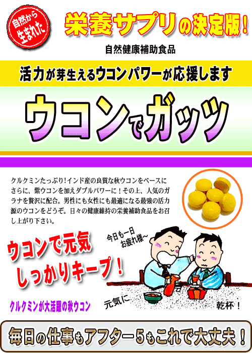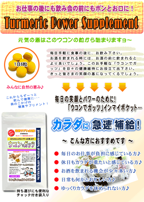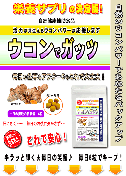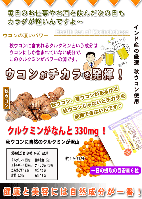 ウコンでガッツ!≪ウコンサプリメント≫ 自然のクルクミンが330mg(一袋当たり) ・・おすすめ商品特徴・・・・・・・ 毎日のお仕事やお酒を飲んだ次の日もカラダが軽いんですよ~ 秋ウコンに含まれるクルクミンと言う成分は、ウコンにしか含まれていない成分で、このクルクミンがパワーの源です。このウコンでガッツ商品は、ウコンをさらにパワーアップしています。 秋ウコンのクルクミンパワーに紫ウコンのシネオールパワーさらに、ガラナのスタミナパワーが大活躍します。三つ巴の成分が心強いですね♪ ・・サプリメント(錠剤)の場合は・・ いつでもどこでも、簡単サプリメントで栄養補給!飲み物片手にいつでも手軽に健康。 新鮮原料をそのまま粉末、飲みやすい錠剤タイプにしていますので、自然のパワーを簡単に取り入れる事が出来ます。 また、他の色々な野菜サプリメントと一緒に飲まれるとより一層のパワーと、毎日の健康維持に良いでしょう。 生野菜サラダなどが苦手な方にも簡単に一緒に摂取できるようにしていますので、毎日の健康維持にどうぞお役立て下さい。 ・・内容(原材料)・・・・ 森のこかげの健康サプリメントシリーズは、自然原料をベースに新鮮100%をそのまま使用した乾燥の健康サプリです。 ・・備考・・・・・・・・・ 保存方法:開封前 直射日光、高温多湿を避ける。 開封後密封して、低湿度または、冷蔵庫などの冷暗所にて保存して下さい。 | |